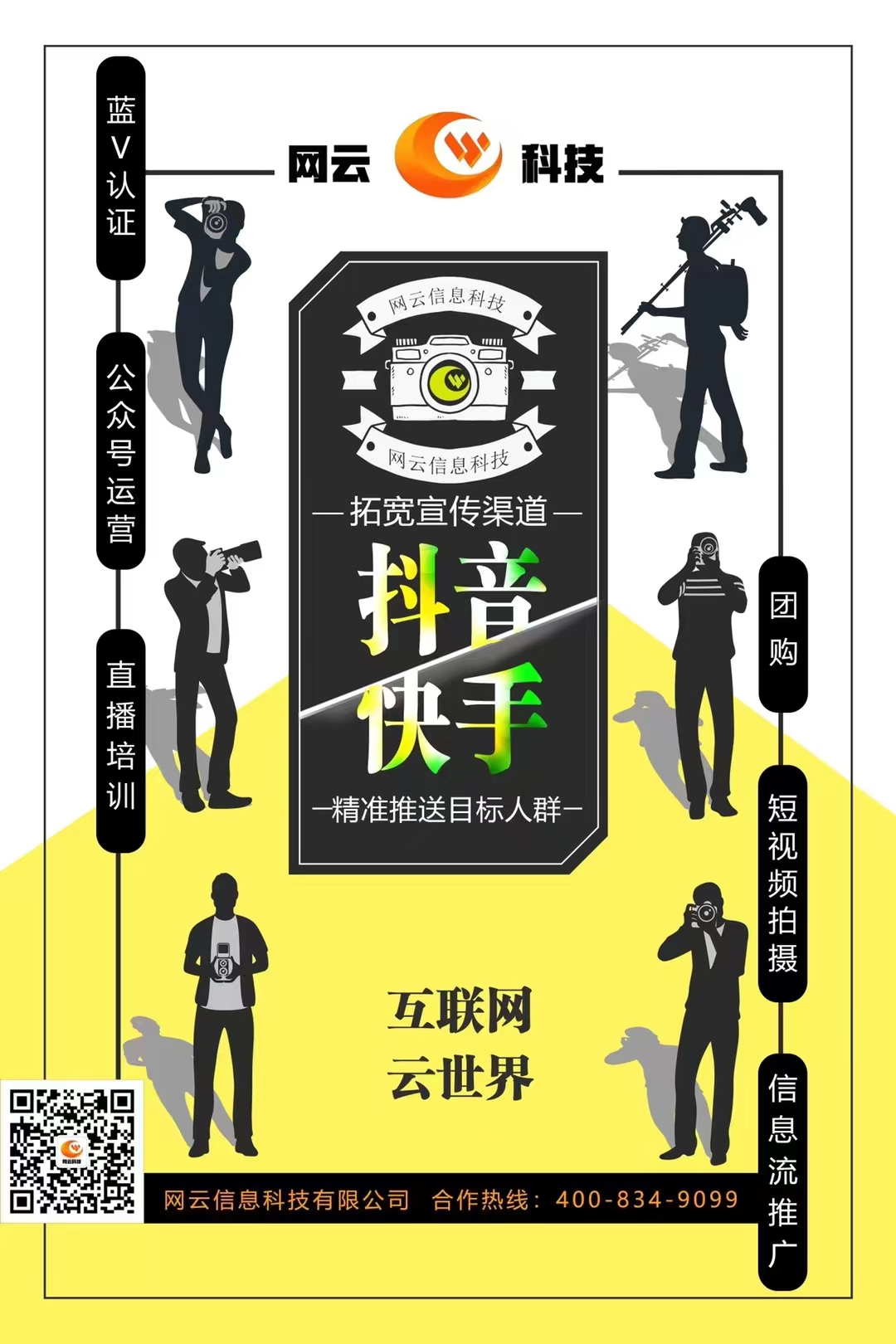 網(wǎng)云自媒體服務(wù)種類多樣,包括藍(lán)v認(rèn)證、團(tuán)購(gòu)、公眾號(hào)運(yùn)營(yíng)、短視頻拍攝、信息流推廣、直播培訓(xùn)??旌臀覀兒献魍貙捫麄髑?,精準(zhǔn)推送目標(biāo)人群吧。 合作熱線:400-834-9099