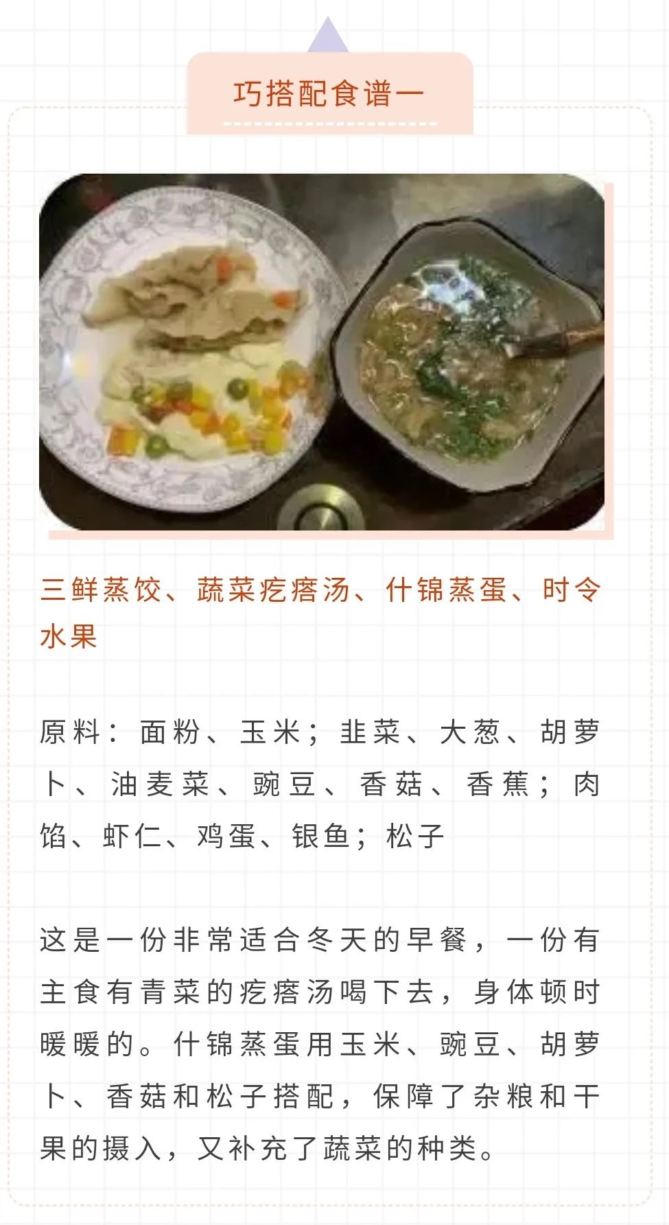 對(duì)于喜歡烘焙的家長(zhǎng),可以嘗試將雜糧、雜豆做成孩子喜歡的點(diǎn)心來(lái)作為早餐的主食。比如這份早餐中的主食就是紅糖發(fā)糕和雜糧面包。在配上薺菜肉餛飩,就是富含膳食纖維的一餐了。
