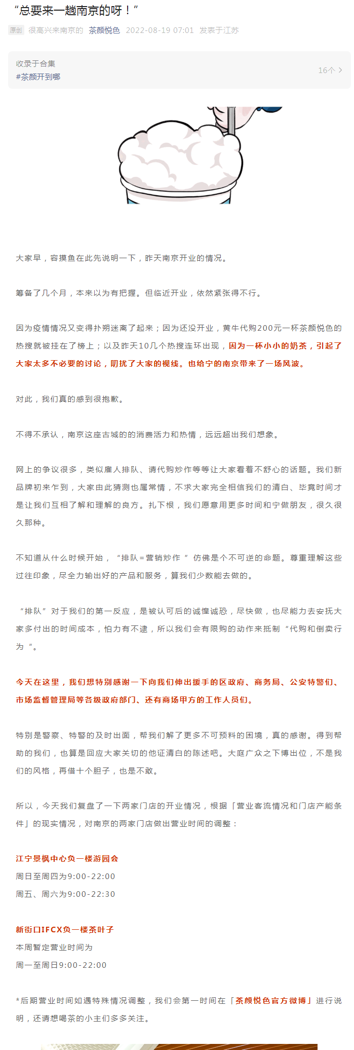 同時,茶顏悅色將根據(jù)營業(yè)客流情況和門店產(chǎn)能條件的現(xiàn)實情況,對南京的兩家門店做出營業(yè)時間的調(diào)整。